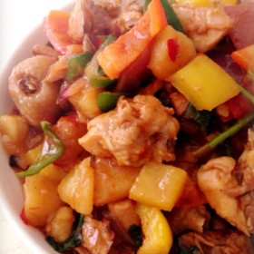 大盘鸡的主要原料是:鸡块和土豆。配上辅料: 辣椒(青、尖) 、红辣椒,调料。经过精心烹饪即成美味的大盘鸡。相传解放前期,一位四川的烹饪高手张师傅为躲避战乱,来到新疆沙湾县落户。他选择在312国道旁开了一家小饭馆,以卖炒面、拌面为生,生意时好时坏。八十年代初的一天,一位长途汽车司机来到他的小店吃饭,随口给张师傅说:炒面、拌面太干,你给我炒一份辣子鸡,多放些汤,再给我拉一些面拌在一起。这句话提醒了张师傅,于是一传十,十传百,这道菜变成了响誉全国的大盘鸡。
