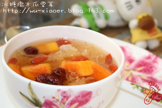 眾所周知,雪耳是窮人的燕窩,它的功效數也數不完, 生津潤腸、補氣潤肺、滋陰補腎、美容嫩膚,比起燕窩 真的毫不遜色! 木瓜有“百益果王”的美名,它的好處不用百度相信童 鞋們都充分了解了。 “燕窩”加“果王”雙管齊下,再加上紅棗、枸杞一起 燉,還有什麼滋潤不了的? 燉好的湯水清甜而粘稠,雪耳滑而軟糯,喜歡的不妨再 加些牛奶一起飲用。