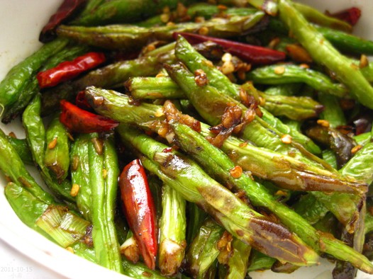 四、锅内放油,油热煎豆角。两面出现虎皮后沥出