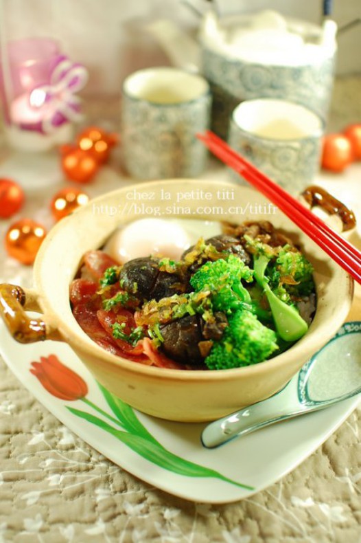 热辣辣、香喷喷,吃到最后全身暖笠笠。在广州,喝茶必然要试,肠粉、生滚粥、云吞面、牛腩粉、牛杂萝卜、干炒牛河等地道风味一定要领略,还有一种饭菜一锅的“草根吃法”你绝对不容错过,那就是带点焦香,冒着热气的广式煲仔饭。粤语中“煲仔饭”的“煲”字真是一语双关:它既是指这种方便快捷的烹饪方法(饭是“煲”熟的),同时又指那个兼燃具和餐具(食具)于一身的器皿——“煲仔”(小的砂锅)。在广州,一年四季都可以吃到煲仔饭。在懒人的记忆中,小时候,每逢秋风一吹,气温骤降之时,在街头小巷里,随处都可见卖煲仔饭的小铺。一排灶头上摆满冒着热气的煲仔,那些比碗稍大的煲仔,都用铁丝缠绕着(粤语“箍煲”,防止爆裂),煲的外面被炉火熏得碳黑,不小心蹭到,立马满手乌黑。看着生米下锅,煮开,加料...米饭垫底,肉菜铺面,一煲就此出炉。香味在深邃小巷里飘荡,挥之不去。直到现在,那香味依旧留在记忆深处,留给我们一份温暖的冬日印象。如今,煲仔饭早已登堂入室,从路边档摊荣升到酒楼食肆。煲仔饭的配料形式多样,可因时因地因人制宜,品种多样,变化多端,简直多到“只有你想不到,没有你吃不到”。很多酒楼饭店都结合自己的特色,推出以某种肉为主打的招牌煲仔饭,不少食肆也以某种秘制煲仔饭打响名堂。一煲即点即做、有荤有素的煲仔饭还送例汤,十文(元)八文(元)吃得丰盛又实惠。“煲”(煮)好后,热辣辣上桌,一人一锅,原汁原味,掀盖即吃,减少热传递。在微寒的季节,这份温暖特别受人青睐。最后一次在广州吃煲仔饭是04年的冬天,转眼5年半过去了。在异国他乡,想吃只能自己煲!由于搬家后懒人家里只有电磁炉,又没有电磁炉专用的砂锅,无法用传统方法做煲仔饭,于是想了个偷懒的办法,就是用电饭锅做煲仔饭。它的好处是方便快捷,不用看火,不会失手,吃完不易上火;缺点是少了传统砂锅特有的焦香(说白了就是糊味),不过对于不喜欢糊味的人来说,也就无所谓了。两种做法各有利弊。为拍照最后只好从电饭锅盛到“煲仔”里在此,懒人推荐一款最常见的腊肠煲仔饭,做法简单快捷,失败率为零。除了冬菇要提前浸泡外,从开水下锅煮米饭到米饭煮熟只需要15分钟,其他配料的切洗准备均能在这15分钟内完成,加上焖肉和菜的2、3分钟以及煮饭前的洗米烧开水,整个过程只需20分钟。最后附上懒人的8秘诀,教你如何在偷懒的同时也能做出传统与地道的广式煲仔饭。20分钟就能吃上荤素尽有、热辣喷香的煲仔饭,懒人们,忙人们,单身贵族们,上班一族们,不用再外食了,心动不如赶快行动吧!