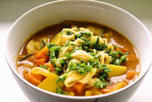 这个面条非常浓香,主要因为这个酱汁非常好吃,至于喜欢配面条还是白米饭,应该各有特色的,不要紧的!这个用黄油面粉和咖喱粉做成的咖喱酱可以一次多做一点,冷却以后储藏在罐子里,想吃了随时配面或米饭吃,就不用每次调配啦!
