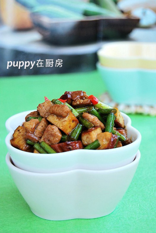 二、豆干切小块,蒜苗洗净切段,小红辣椒切圈