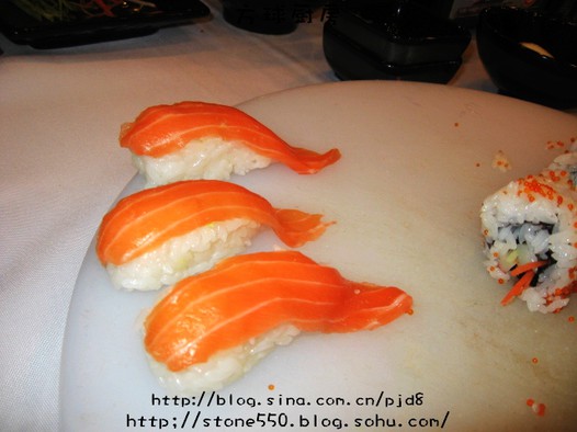 寿司我认为是很吸引眼球的食物,美观漂亮,色彩鲜明,既能当饭又能当菜,既可以作做小吃也可作正餐,简单自然,秀色可餐。原来我以为做寿司很难呢,这回出去学习才知道原来寿司也是纸老虎一个,咱普通家庭主妇也完全能够攻克。只要你材料新鲜,寿司想不好吃都难,哈哈。