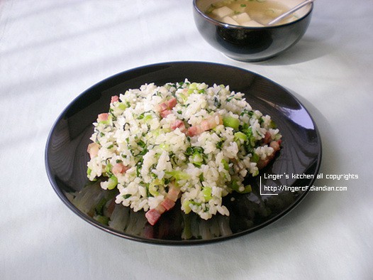 三、原锅倒入冷饭中火翻炒,调入盐和1勺清水;炒至米饭变热饭粒散开时,倒入咸肉和青菜炒匀,出锅前加少许鸡精。