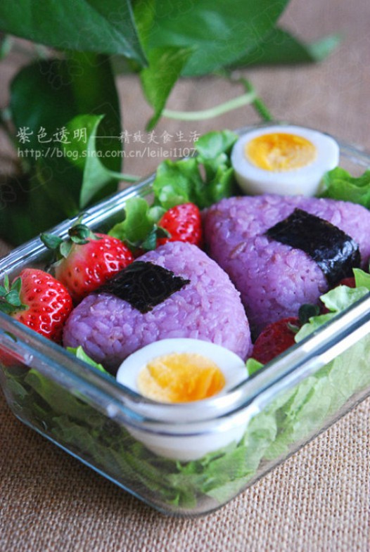 天气越来越暖和了,大家都开始跃跃欲试动起来,出行、春游什么的了。那么我就来准备一道适合出游带着的便当餐吧。我用的是紫甘蓝榨出的汁来蒸的米饭。做好后没有特别的味道,但颜色很纯正哈。饭团考虑到隔夜等其他问题,没有添加油腻或者海鲜的内馅。我放了肉松和泡菜,包在饭团内。既不怕因隔夜影响口感和味道,在吃的时候因为加入了日式泡菜,吃起来也不会觉得单调。我还做了黑米的,口感不如普通大米的粘糯,黑米的需要提前浸泡2小时再蒸效果会更好。