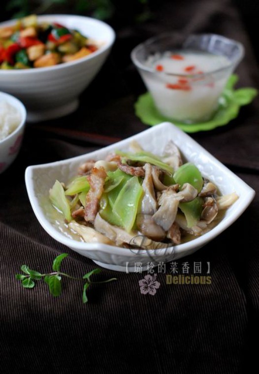 简简单单,清清爽爽,有肉有菜,非常快手而且下饭的一道菜。这个菜营养搭配十分合理,既能满足爱吃肉肉人士的口福之欲,又无须有体重增加的困扰,青笋,也叫莴笋,含有大量的植物纤维素,能促进肠壁蠕动,促进消化,而平菇富含好多种维生素、矿物质,特别是蛋白质含量是鸡蛋的两倍多呢,想不到吧!