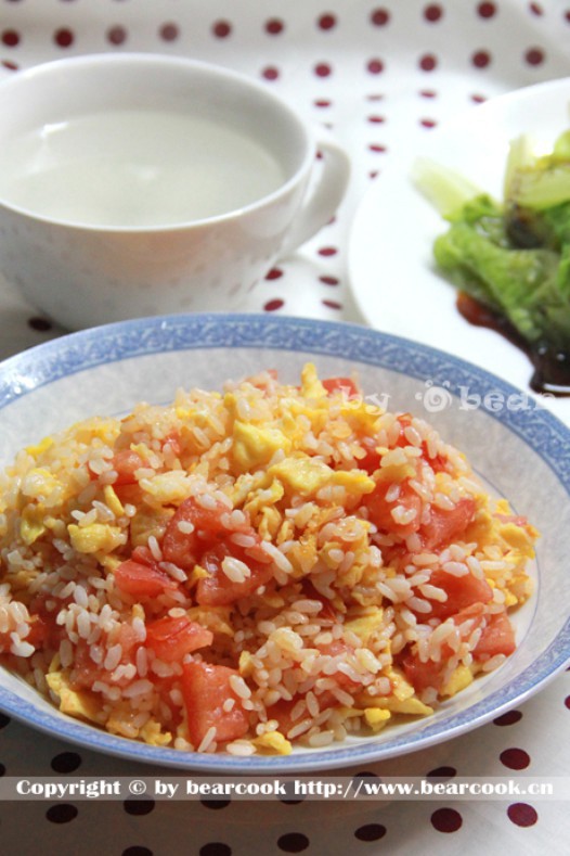 二、稍微凝固的时候,就下米饭,多炒一下,还是尽量把米饭炒干,最后放番茄丁,翻炒至番茄微微出汁,适量盐调味,再翻两下就好了