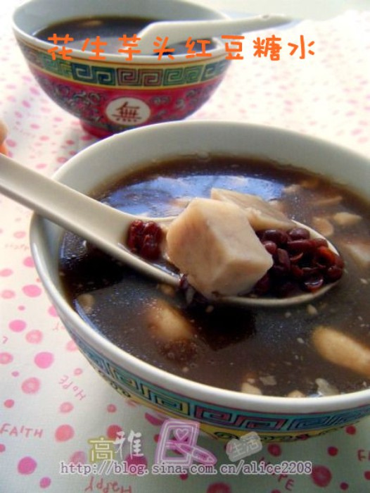 一、红豆和去皮的花生米洗净,放入煲内,加入适量的清水和冰糖,小火煮至开始材料软烂,熄火,焖在煲内半小时