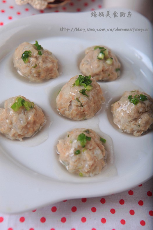 二、手上沾少许水,将搅打上劲的麦片洋葱猪肉馅团成圆形,放入蒸盘中,入开水锅里中火蒸12分钟取出撒上葱花