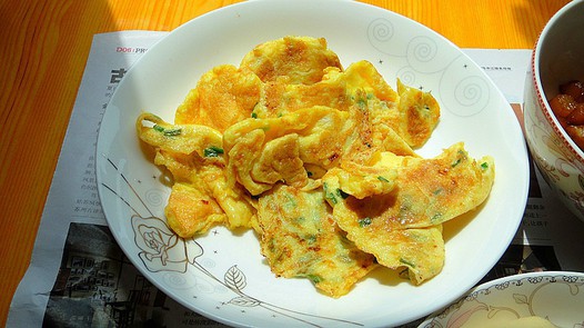 二、锅里放2汤匙油,烧热之后倒入蛋液,用筷子搅成小块,再翻炒至两面金黄就可以吃啦:)