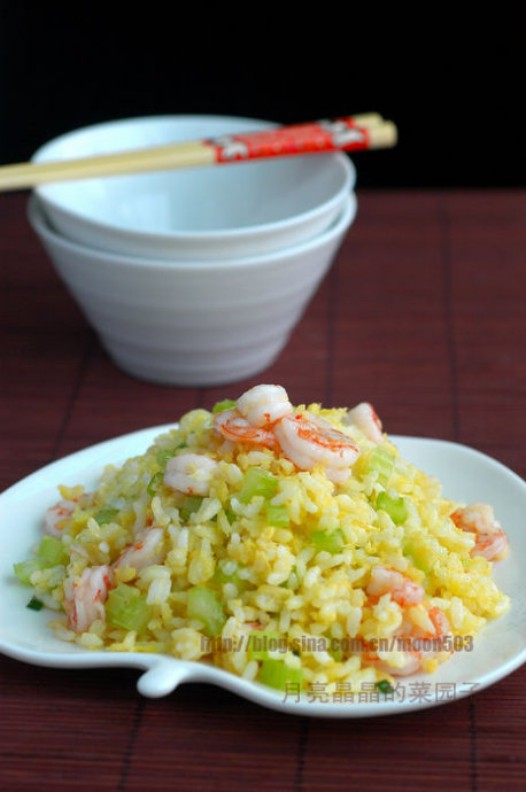 一、虾去头剥壳,背上剪开抽出肠泥。西芹洗净切成小粒