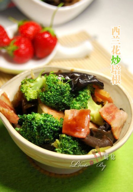 一直不是很爱吃花菜。在我眼里,西兰花也是花菜的一种,换了绿装的花菜而已。所以一样不爱,平时买的少,吃的更少因为它吃到嘴里实在是寡淡无味。菌类也淡,但一经激发,就成味中珍鲜。而西兰花无论怎样搭配,它始终是一副我行我素、清心寡欲的模样,直吃的人嘴里淡出个鸟来~但实际上,不论是白色的花菜,还是绿色的西兰花营养都很丰富,西兰花、花菜等甘蓝族蔬菜,已被营养学家列入人类的饮食抗癌食谱中。美国防癌协会甚至要求美国人们在日常膳食中,必须增加十字花科的菜谱。从中医角度而言,菜花性平,味甘,可强肾壮骨、健脾养胃,适用于久病虚损、腰膝酸软和脾胃虚弱者。现代研究表明,菜花是含类黄酮最多的食物之一,而类黄酮具有抗癌作用,长期食用菜花可以减少罹患乳腺癌、直肠癌及胃癌等癌症的几率。类黄酮除了可以防止感染,还是最好的血管清理剂,能够阻止胆固醇氧化,防止血小板凝结成块,因而减少心脏病与中风的危险。西兰花中此物质含量更高。另外,西兰花还具有杀死导致胃癌的幽门螺旋菌的功效。知道了西兰花如此多的好处,再不像以前那样不待见它了试着去接受它,用一些平时喜欢的食材和它搭配在一起比如今天我用了黑木耳、培根和它同炒,碧绿清脆的西兰花、滋味咸香的培根、还有健康的黑木耳、不论从色彩、口感、还是营养学方面来说,都是相当不错的!