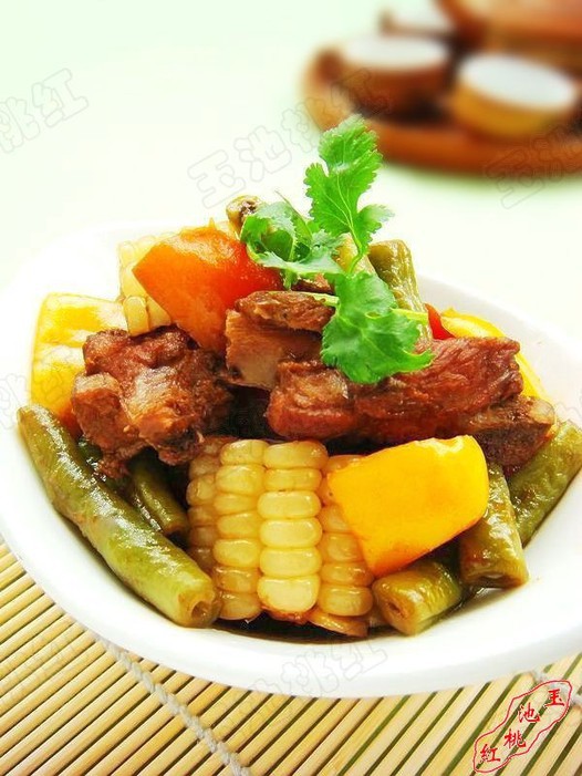 七、将玉米、豆角和胡萝卜放入锅中,大火煮开后转小火煮15分钟