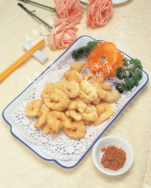 三、勺内加花生油烧热,将虾仁拌入薄糊,逐个下入油中,炸至九成熟时捞出装盘即成,上席带花椒盐