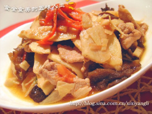 四、最后加入肉片,西红柿。调大火。肉汁的香和冬笋混合在一起更诱人。待汁快收干时加盐调味即可