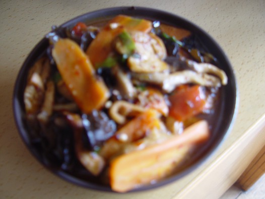 三、用煎豆腐剩下的油将胡萝卜等下锅炒1分钟,然后将豆腐和木耳也倒下锅一起翻炒。