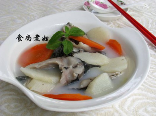 一、鲫鱼洗净、切块。山药、胡萝卜切块,生姜切片