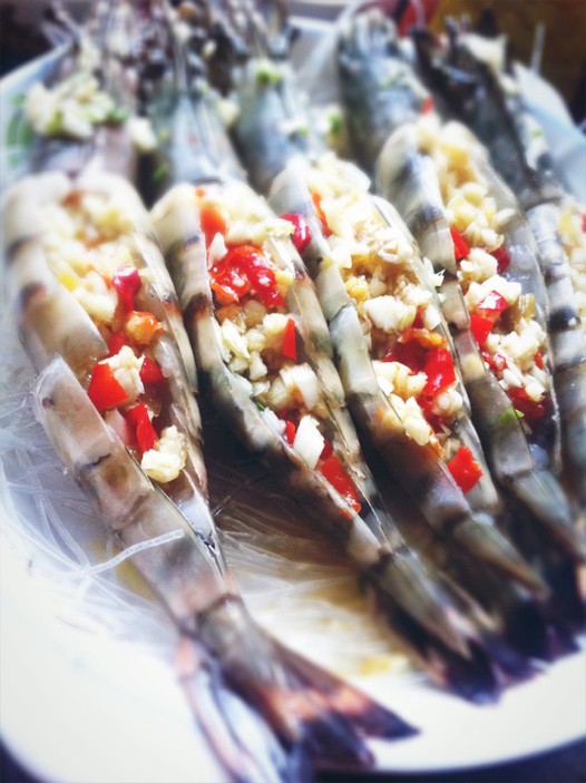 四、香菇/生姜切薄片垫底,铺一层粉丝,浇上爆好的香油和一点酱油,码好塞满蒜泥的虾