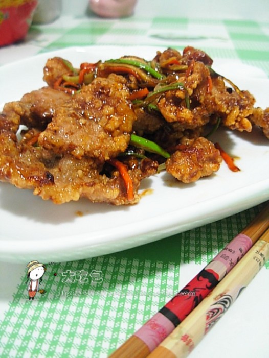 三、锅里放油,到五成热时下肉片炸八成熟,捞出。然后等油温八成热时下入复炸一次,炸酥。留少许底油