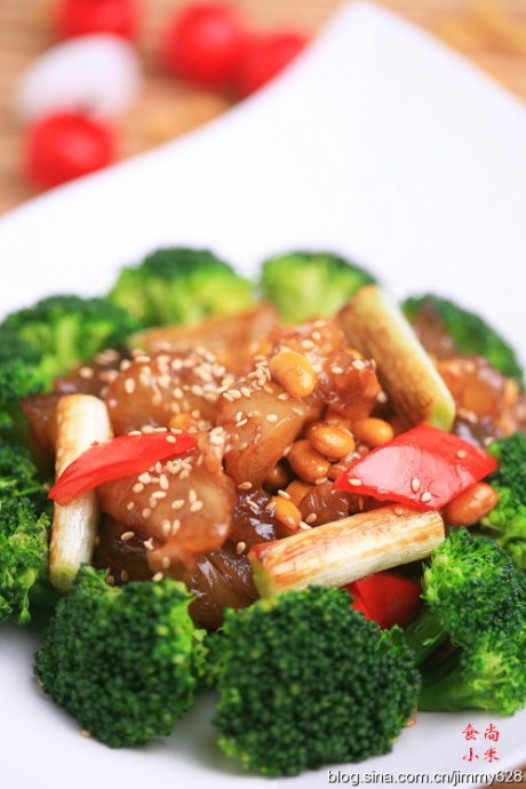 一、将蹄筋洗净切斜刀块、大葱切寸段、西蓝花切小块