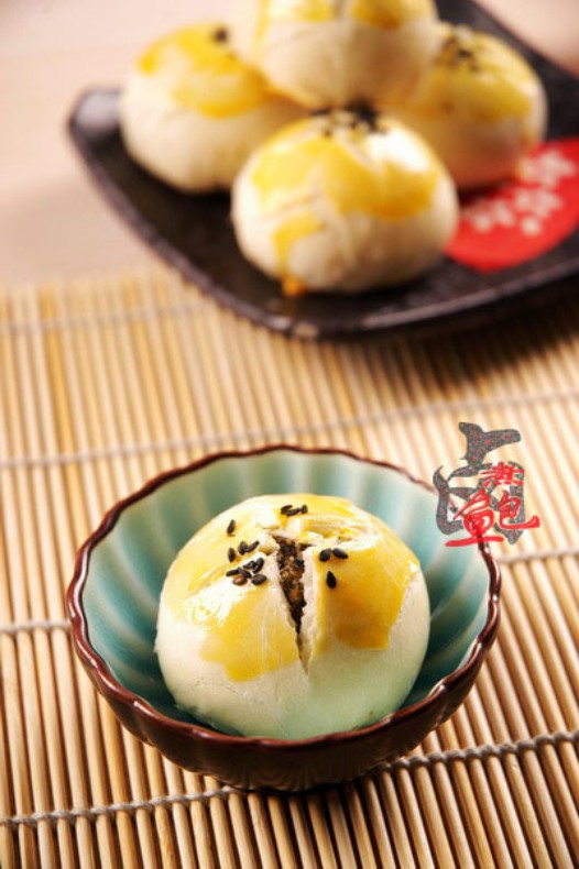 十二、包入绿豆沙馅,包口冲下,单手整型法,整圆
