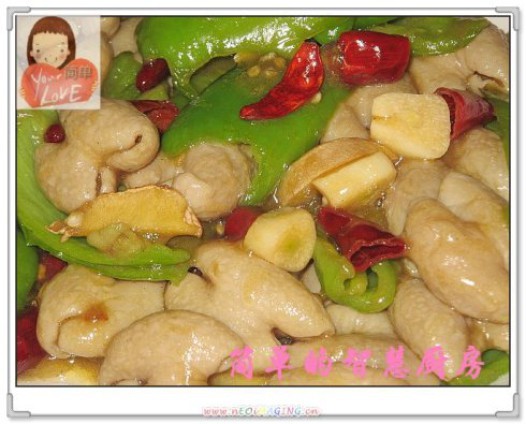 五、加油进锅,加进青椒,翻炒几下,放点高汤,放点盐。青椒炒成五成软,加点鸡精起锅备用。再起油锅,油热放大蒜,姜,辣椒爆一下再把肥肠丢进去,翻炒,加糖、六月鲜备用的青椒倒进去,大火翻炒,出锅前淋水淀粉