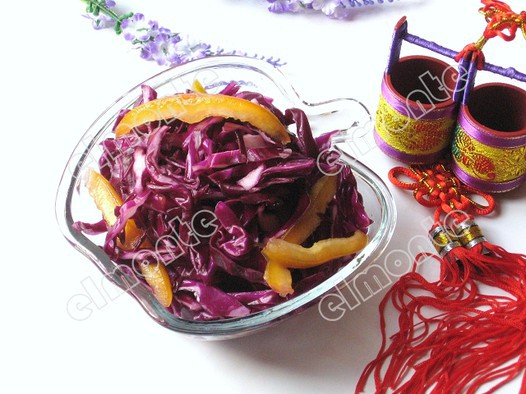大过年吃肉吃多了,来点清爽的蔬菜很不错。据说紫色的蔬菜有防癌,抗癌,抗衰老的功效,多吃点紫色的蔬菜准没错。甘蓝菜含有丰富的维生素A,C和E和其他的微量元素,经常吃能强身健体,增强身体的免疫力。甘蓝类蔬菜可以减轻关节疼痛症状,能防治感冒引起的咽喉疼痛。最近家人感冒咳嗽不断,只好让他们做一回兔子,多吃点蔬菜水果,清清肠胃。紫色甘蓝菜凉拌着吃很不错,餐馆里的菜单还给它起了个很美的名字叫紫气东来,今天咱也效颦一次吧。