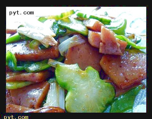 一、少许油烧热,把盐,胡椒,花椒都放进去炒香,放入葱,姜,辣椒,西兰花梗炒炒,有香味了就行了,再放午餐肉,炒炒,放老抽上色,就可以盛吃了