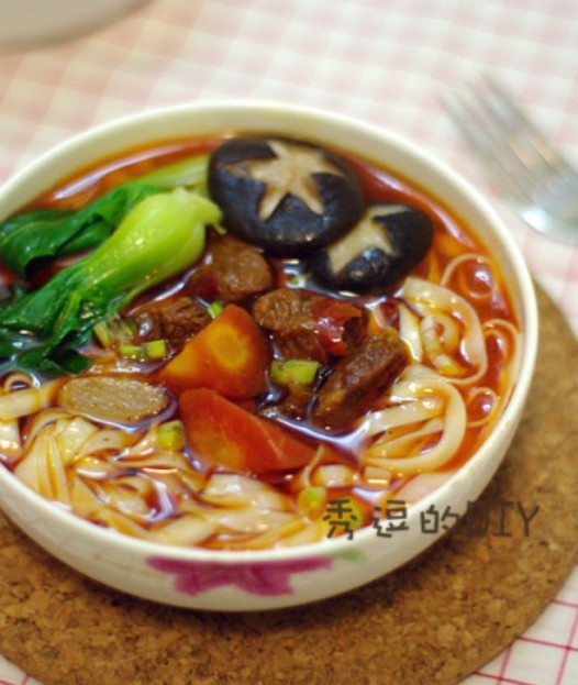 六、最后,就是煮一碗面,加点青菜加点香菇,最后淋上红烧牛肉汁。一碗香喷喷、热腾腾的红烧牛肉面就可以开吃了