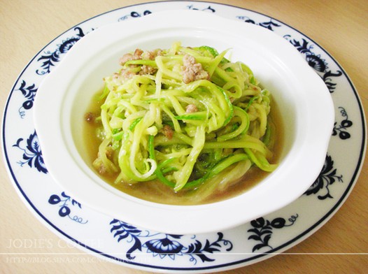 三、待肉馅的颜色变白时,放入少许生炒、糖调味翻炒,待肉馅炒出符合香味后,下入西葫芦丝翻炒,待西葫芦丝颜色变时加盐、鸡精调味即可