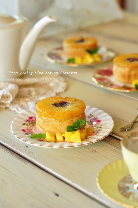 第一次知道菠萝翻转蛋糕是看绝望主妇。大多数菠萝翻转蛋糕,都跟剧情里Bree做的那个一样,是很大一个,上面整齐排列着菠萝圈,菠萝圈中心是一颗樱桃,这是最经典的造型了。不过其实在吃过菠萝翻转蛋糕之后,对这种蛋糕并没有太多好感。我喜欢吃菠萝,可是大部分菠萝翻转蛋糕比较甜,口味也很单一。前几天偶然翻到这个方子,第一感觉是造型很好看,单独一个个的,迷你造型;而且看了方子,算是比较低热量的,加上家里又刚好有一颗新鲜菠萝,就做来试了试。结果,试的结果是,这个蛋糕做出来真的很美貌,做法也真的很简单,不过味道方面还是蛮普通的,没有什么惊艳的地方(感觉所有菠萝翻转蛋糕都逃不出这个魔咒啊),蛋糕体的质地也普通。这类以甜为主的蛋糕总的说来我不是那么爱。不过,如果在吃的时候,加上一球清新感觉的味道偏酸的柠檬味冰激凌,搭配着吃,就蛮不错的。想了半天要不要把方子分享出来,最后还是觉得写出来吧,虽然蛋糕体比较一般,但胜在造型可爱,也许聪明的你们可以利用这个造型,但是蛋糕体换成其它味道更清新的口味,就两全其美啦!原方在TasteofHome上看的,其实我做的时候分量修改过的,因为自己的模子跟原方那个不一样大,而且做了四个而不是两个,写出来的是原方,或者更建议改成其它你们喜欢的蛋糕体方子来做。