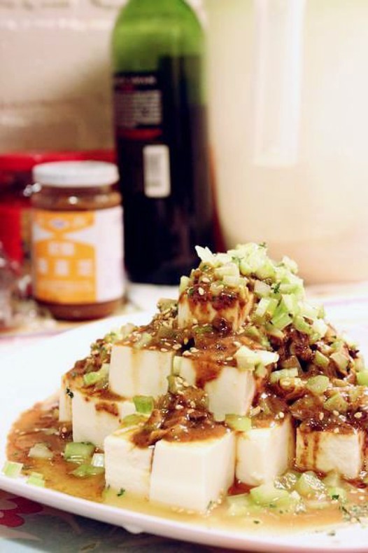 三、将调好的麻酱汁淋在豆腐上,撒上芝麻,另外一半芹菜末,以及香油,花椒油。吃吧