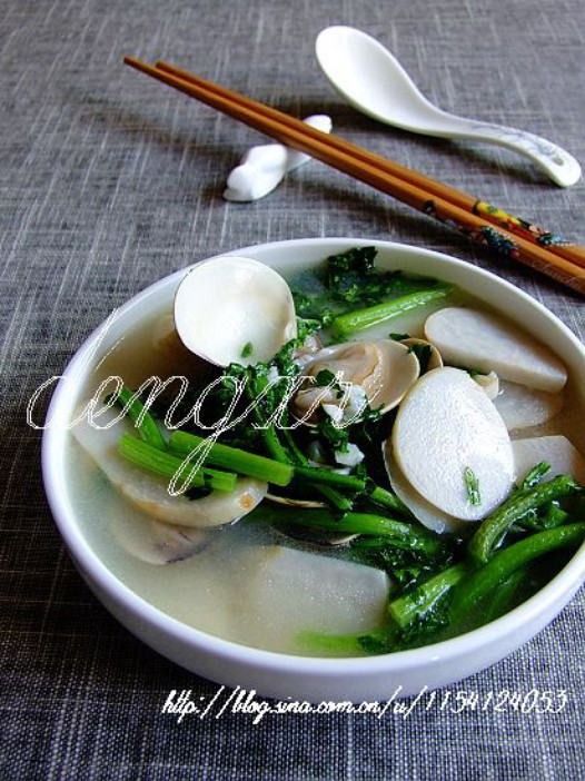五、炖至芋头软烂,文蛤开口,加入茼蒿段煮开