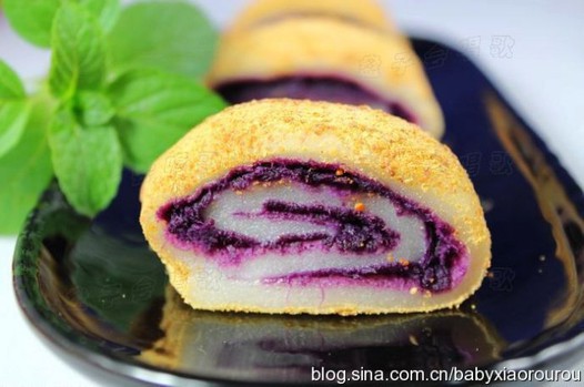 前几天大太阳的好天气,我把家里的干货都翻出来晒晒太阳,发现囤积了好多的干黄豆,都是五一,国庆回老家带来的,平时也只有周末用来做做豆浆,或者炖骨头汤的时候放一点,消耗的速度太慢了。万一碰到连续潮湿的天气,估计要生虫了,不行不行,赶快得想点法子消耗的快点,杜绝浪费。我想到的第一个最便捷的解决方案:铺上一烤盘,烤箱烤熟烤脆当零食吃,嗯,不错,磨牙的好东西后来发现吃多了面部肌肉嚼的酸疼,而且公婆牙齿不是太利索,吃吃还蛮辛苦的,于是,我有想出了第二个方案:烤脆的黄豆打成粉,做驴打滚。哦也,做成这种小吃,用来当我们的早点也是非常nice的选择呢。驴打滚,是北京小吃中最古老的品种之一,它的原料是用黄米面加水和软、蒸熟。另将黄豆炒熟后,碾成粉面。制作时将蒸熟的黄米面粘上黄豆粉面,再擀成片,然后抹上赤豆沙馅(也可以用红糖)卷起来,切成小块即可食用,对于传统的驴打滚的做法,我稍微改良了一下,没有黄米面,就用普通的糯米面代替,里面的豆沙馅,换成了紫薯馅,最后的成品让我感叹:夹心的紫色,真的很惊艳,每次用紫薯做美食都是惊喜啊!紫薯控的朋友们,有木有这么觉得啊!