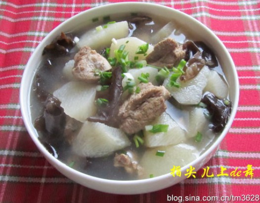 三、待排骨汤煨至三十分钟后加入山药和黑木耳,再小火炖二十分钟,呈出后加盐等调味即可