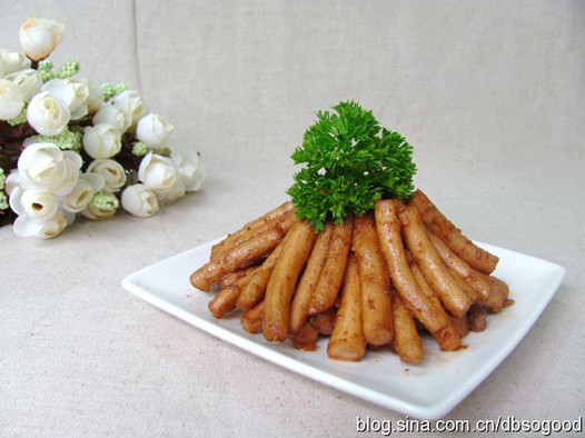 二、新鲜茶树菇半斤,去掉头尾,切成一段段备用