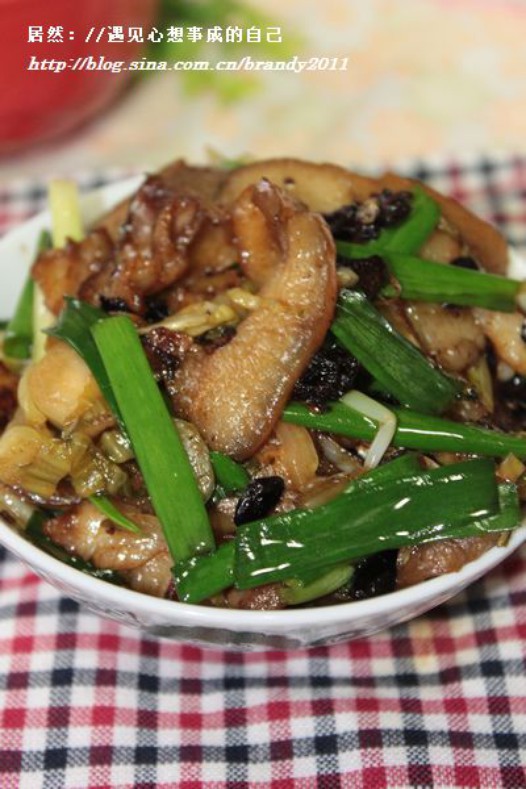 八、把猪头肉丢进去爆出油,加入豆豉,料酒酱油,然后加入酸菜