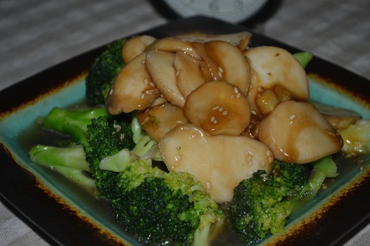 四、接着将杏鲍菇爆炒后,只用加盐哈,直接扣上西兰花表层。。