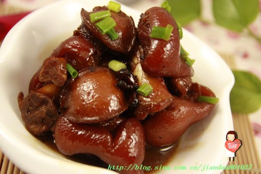 二、锅里放油,放入冰糖,炒个糖色,将猪脚和鲍鱼放入,喷料酒,放盐、八角、陈皮,足量的水,水基本上要没过猪脚,大火煮沸后转小火,3个小时后大火收汁出锅