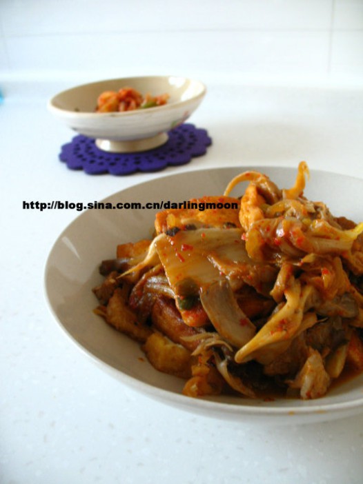 四、放入辣白菜翻炒,再放入平菇丝,翻炒至平菇出汤变软