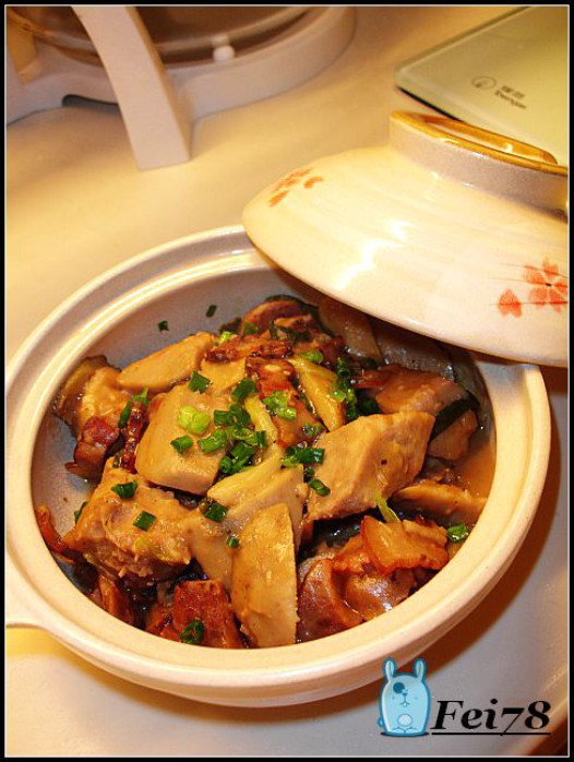 转到小砂煲里上火继续焖一会,让芋头更松化,因为我买的是“荣华”的腊肠,酒味较浓,想不到做出来的整煲的味道,香喷喷。。。所以如果大家做这个腊肠煲如果腊肠本身的酒味不足,可以加几滴白酒进去,会香好多好多~~整煲的芋头吸收了腊味的香味,配上腐乳淡淡的香味,真是下饭一流~~