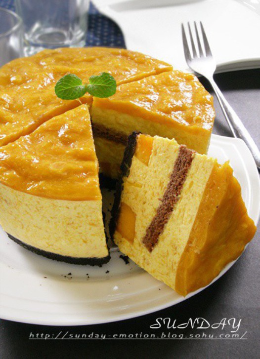九、再倒入另一半芒果奶酪糊,入冰箱冷藏至少4小时
