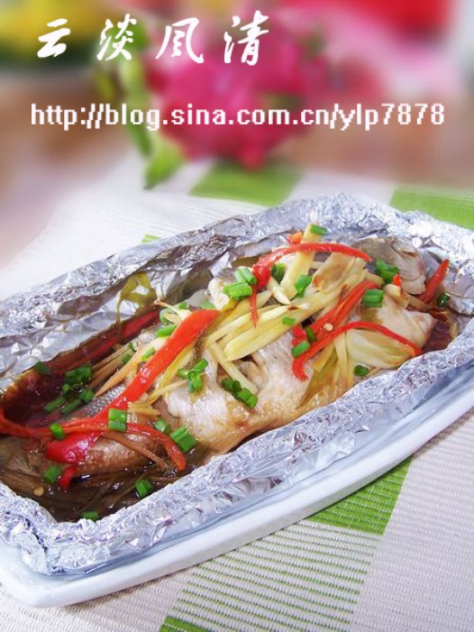 七、再将剩余的葱、姜、蒜、红椒铺在鱼身上。最后将锡纸容器的口合起来,折几道,做成一个锡纸包