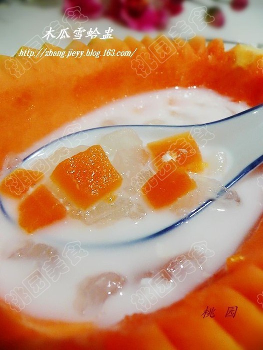 三、木瓜取出果肉切块(我用了一半的量打了木瓜奶昔汁,分别加入雪蛤盅中)