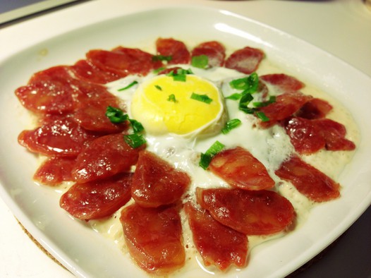 一、将香肠斜切成薄片,码在盘子里中间预留一些空间给鸡蛋。