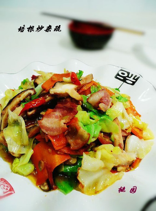 三、起热锅,入少许油(或不放油,直接将培根放入热锅中),三成热时入培根翻炒至熟,下葱姜蒜末及指椒粒炒香,下胡萝卜片炒至变色