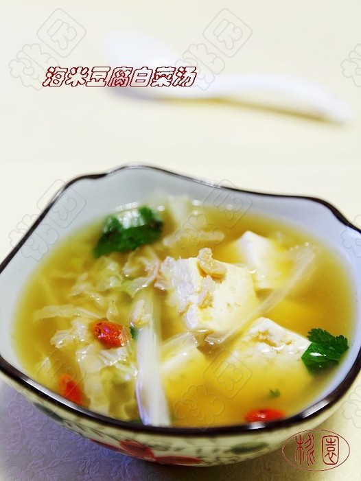 四、取砂锅,倒入鸡汤或水,下入海米、豆腐,大火烧开,关中小火慢煮20分钟
