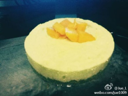 奶油奶酪最好是软化好再扔进搅拌机里~蛋糕上面可以放一些芒果块做装饰~