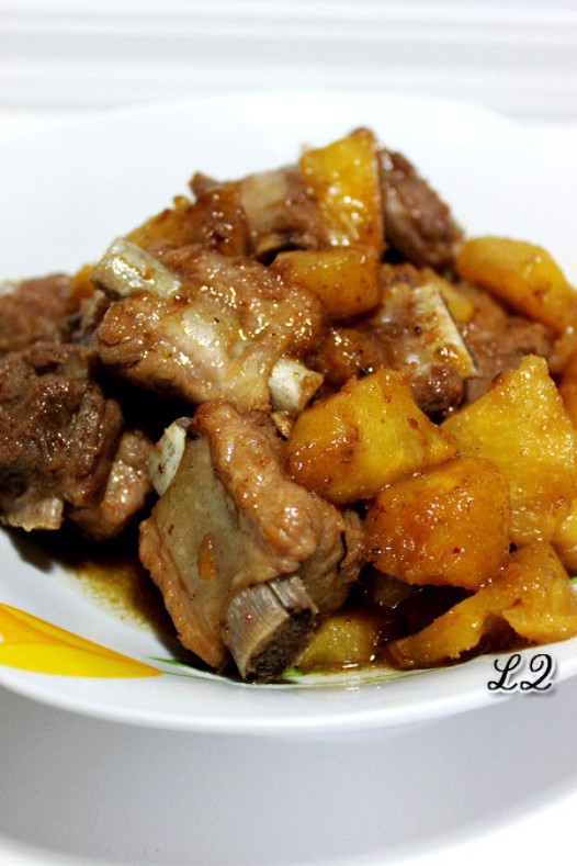 三、热锅入油,爆香姜蒜末,倒入排骨中火翻炒至变色,倒入菠萝炒片刻,加入适量清水(以没过排骨为准),转大火煮沸后加入些许酱油、适量盐,加盖以中小火焖