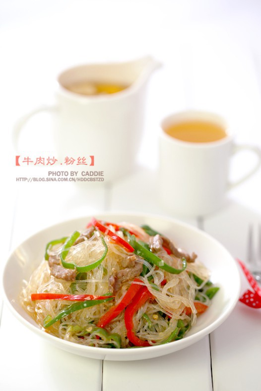 六、加入泡好的粉丝和少许清水炒软